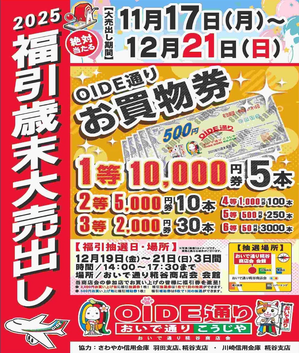 2025年11月17日(月)~12月21日(日)に商店街売出し参加店で500円お買い上げごとに福引補助券1枚(6枚で1回抽選)、3000円お買上げ毎に福引抽選券が1枚もらえます!