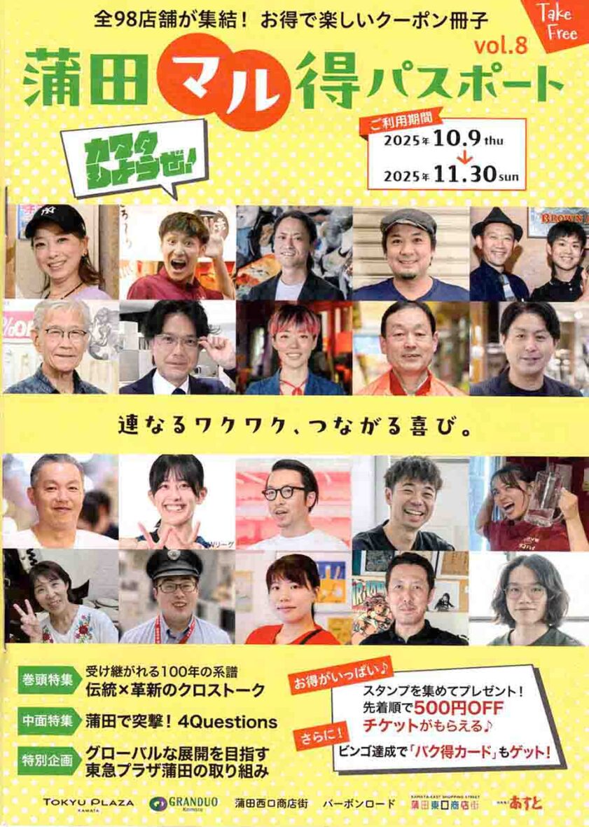 「蒲田マル得パスポート」は、地域の方とお店との新しい出会いを創出し、蒲田での買い回りを促すことで街の活性化につなげることを目的としたお得で楽しいクーポン冊子。