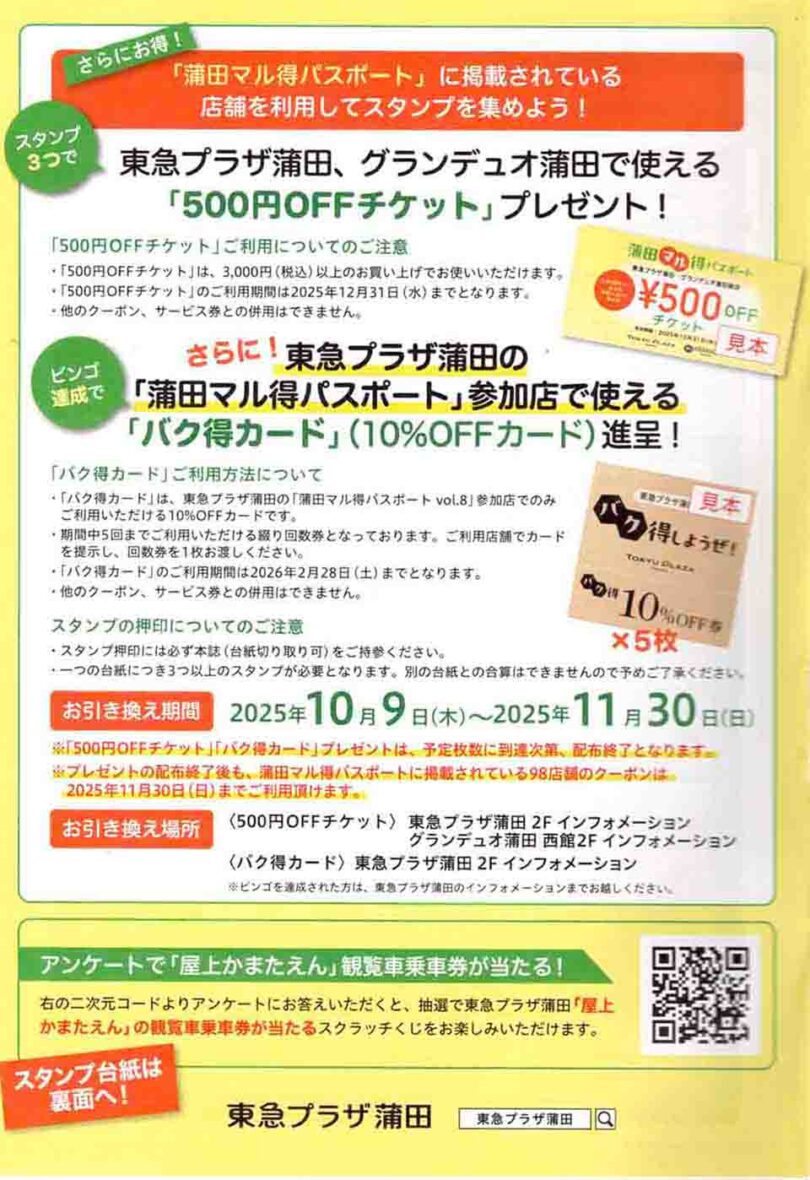 ▼掲載店舗を利用してスタンプを3つ集めると、東急プラザ蒲田とグランデュオ蒲田で使える【500円OFFチケット】プレゼント!!