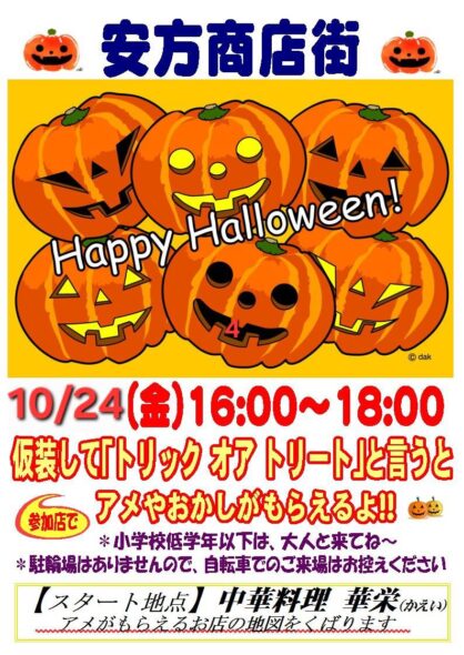▼内容:スタート地点である安方商店街内の「中華料理 華栄」に集合して、アメがもらえるお店の地図をGET!仮装して参加店で『トリック・オア・トリート』というと、アメがもらえます♪