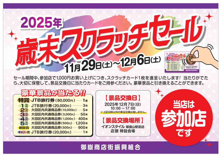 御嶽商店街振興組合にて、11月29日(土)~12月6日(土)に「2025年歳末スクラッチセール」を実施します。