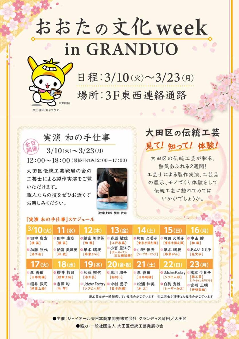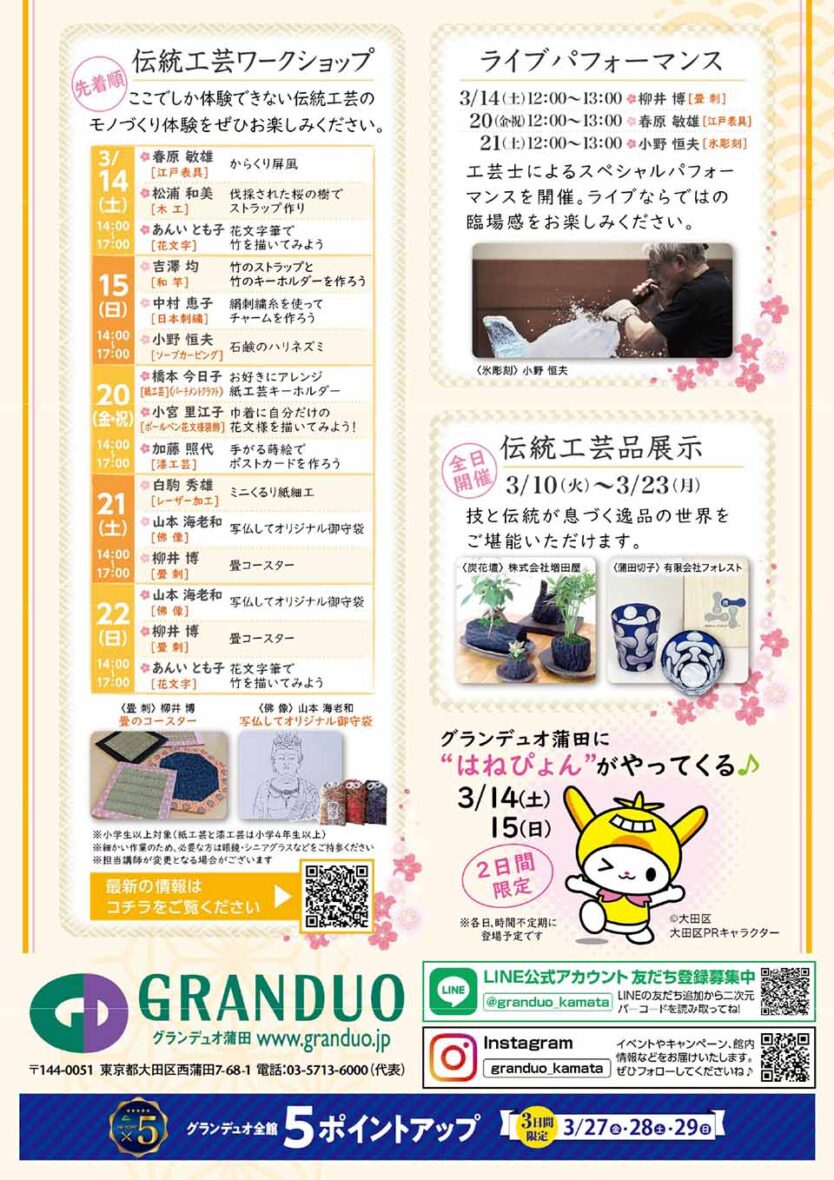 ▼内容:区内の伝統工芸士による実演やワークショップ、ライブパフォーマンス、作品展示などが行われます。3月14日(土)、15日(日)には会場に、はねぴょんもやってきます!
