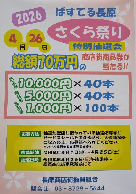 長原商店街では総額70万円の商店街商品券が当たる「さくら祭り」を開催します。2026年4月1日(水)から25日(土)までの間に、抽選応募券にサービスシール20枚を貼って応募、4月26日(日)に抽選を行います。商店街商品券1万円、5000円が各40本などが当たるチャンスです。