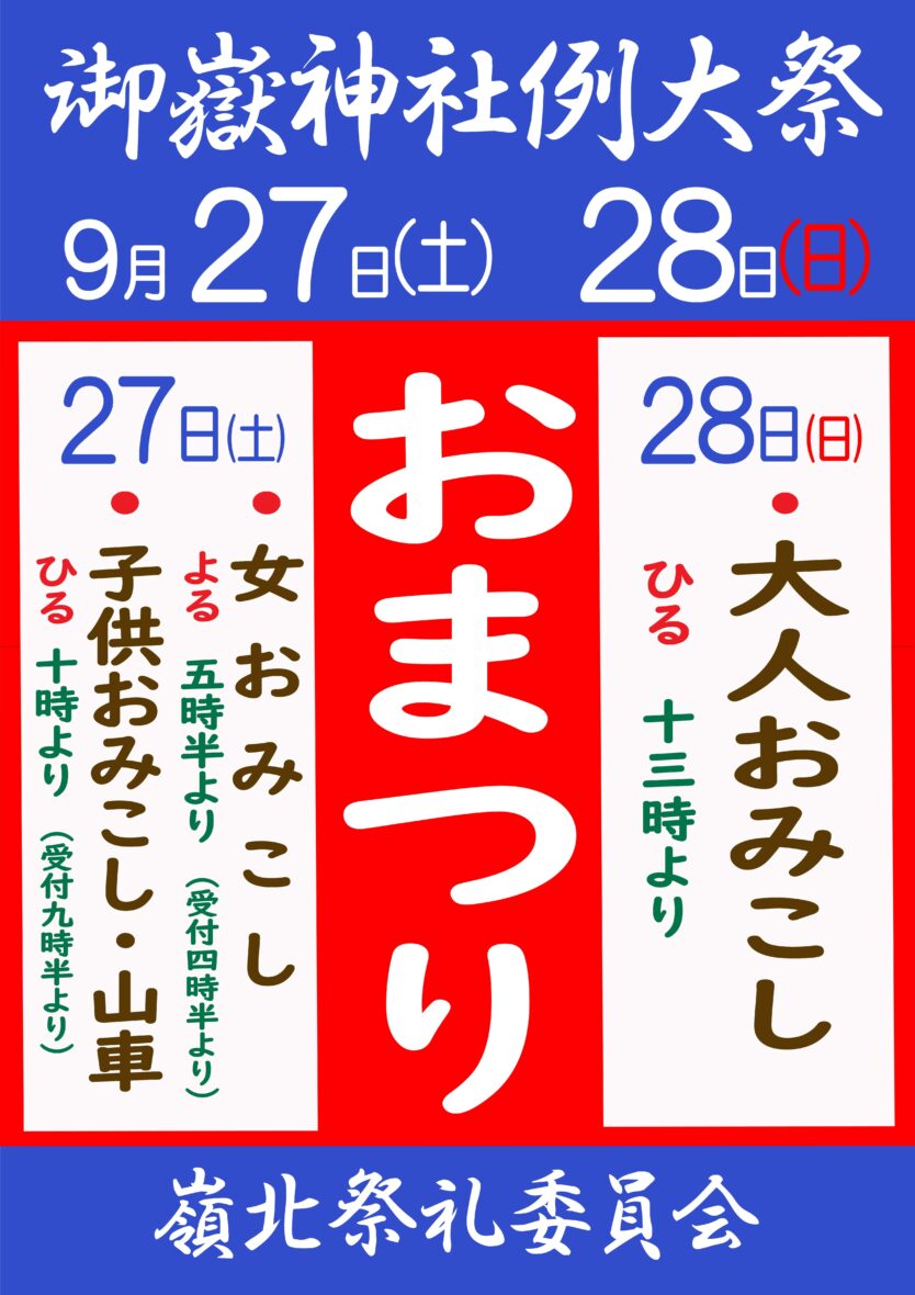 女おみこし:17時半~(受付16時半~)、子供おみこし・山車:10時~(受付9時半~)