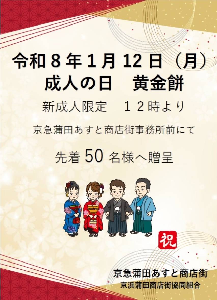 東京都大田区の京急蒲田あすと商店街(京浜蒲田商店街協同組合)で、2026年1月12日(月)成人の日に「成人祝黄金餅」が開催されます!