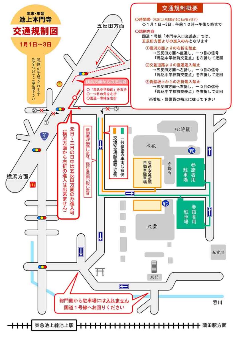 正月三が日の本門寺周辺の交通規制図も紹介しています。
