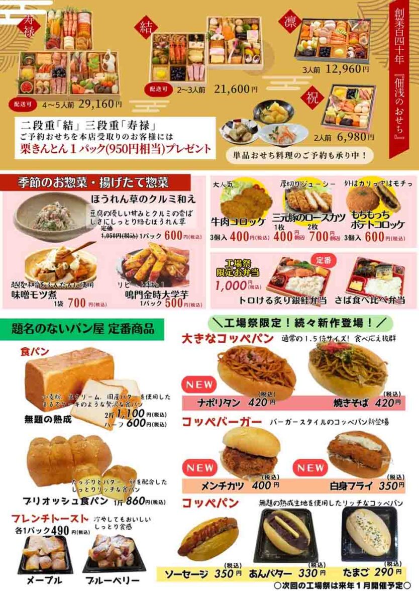 1884(明治17)年より佃煮・惣菜専門店として関東圏の大手百貨店や商業施設にて商いを続けてきた老舗、株式会社 佃浅(つくあさ)商店が展開している高級食パン専門店「題名のないパン屋」。佃浅商店・題名のないパン屋大森本店で通常の商品をお得な価格で提供する「工場祭」を行います。