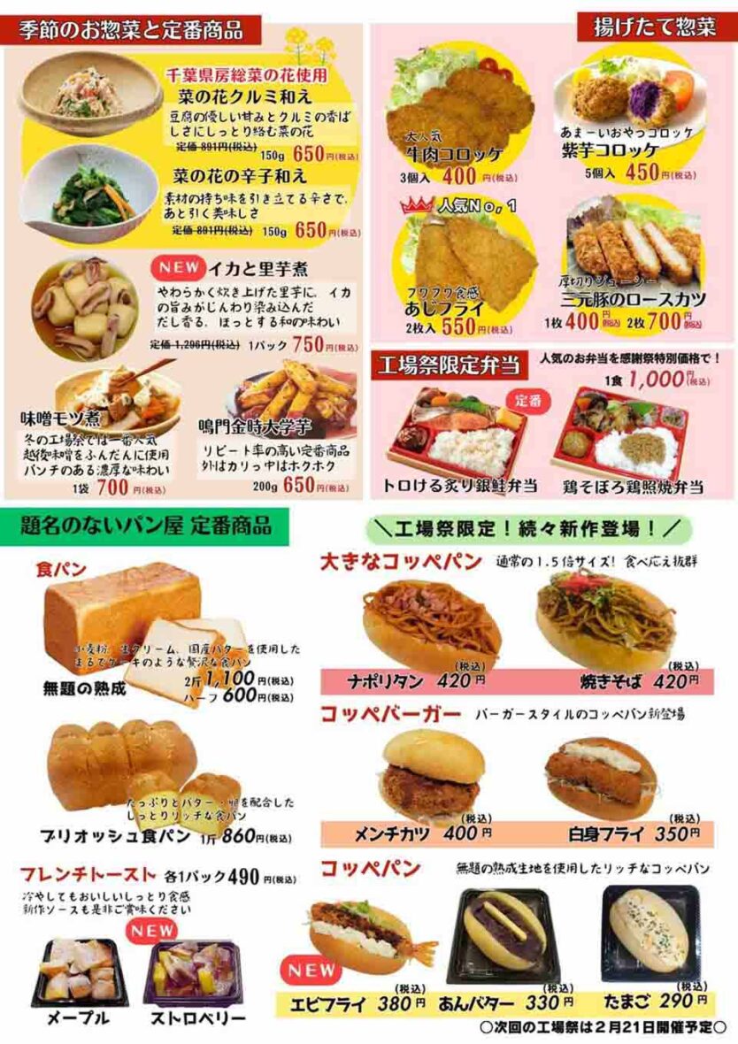 ▼内容:人気の各種魚の切落とし、お惣菜、お弁当、食パンなど工場祭価格でさまざまな企画を用意しています。今回はおせちもあります。
