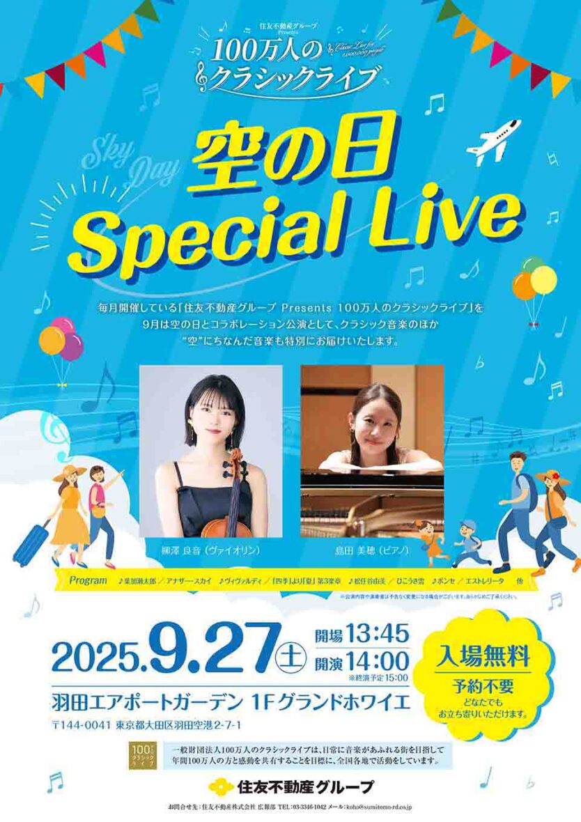 プロの演奏家による本格的なクラシックライブが楽しめる「住友不動産グループPresents 100万人のクラシックライブ 空の日 Special Live」が開催されます。