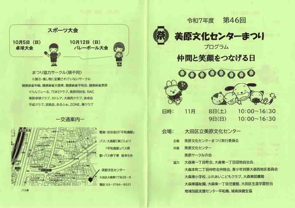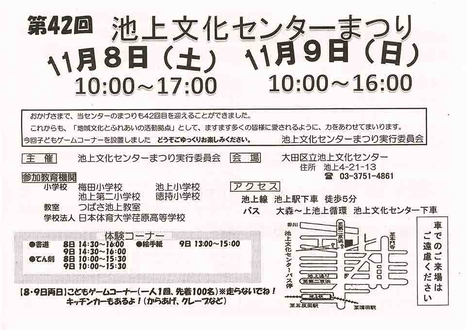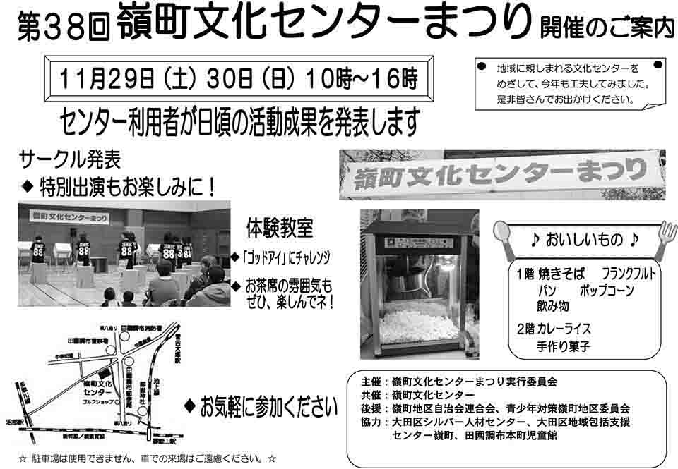 アクセス:駅の西口に出て環状8号線を右(蒲田方面)に進み、右側に「ガクヨー」の看板が見えたら、その手前の角を右に直進します。左に糀谷中学校が見えたら、そこから二つ目の四つ角を左に曲がり、すぐの四つ角を右に、糀谷特別出張所を過ぎて最初の角を左に入ると文化センターです。