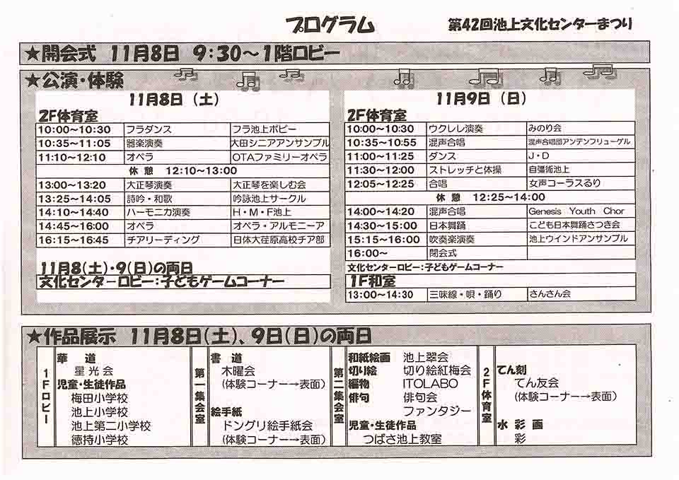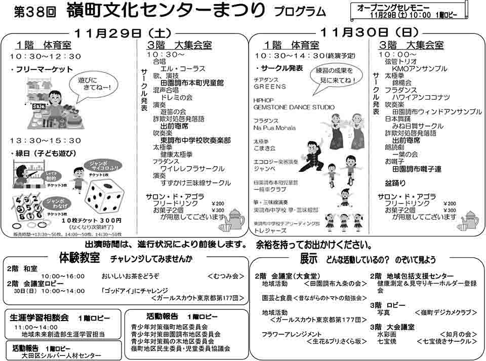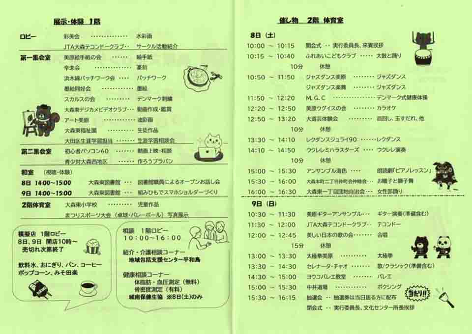 また、地域の人と人との出会いと交流、学習成果の発表を目的に文化センターまつりを開催しています。サークルや団体など地域の多くの人々が力を合わせて準備を行い、学習、文化、スポーツサークルなどの多彩な展示や発表、体験コーナーなど楽しい企画が盛りだくさんです。