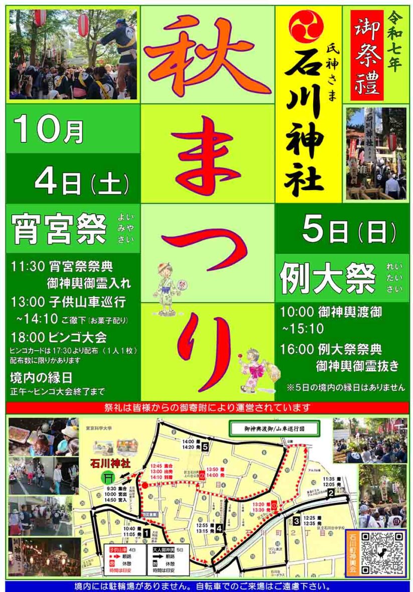 4日(土) 11:30 宵宮祭祭典・御神輿御霊入れ/13:00 子供山車巡行/18:00 ビンゴ大会(ビンゴカードは17:30から配布・1人1枚)/12:00〜ビンゴ大会終了まで境内で縁日