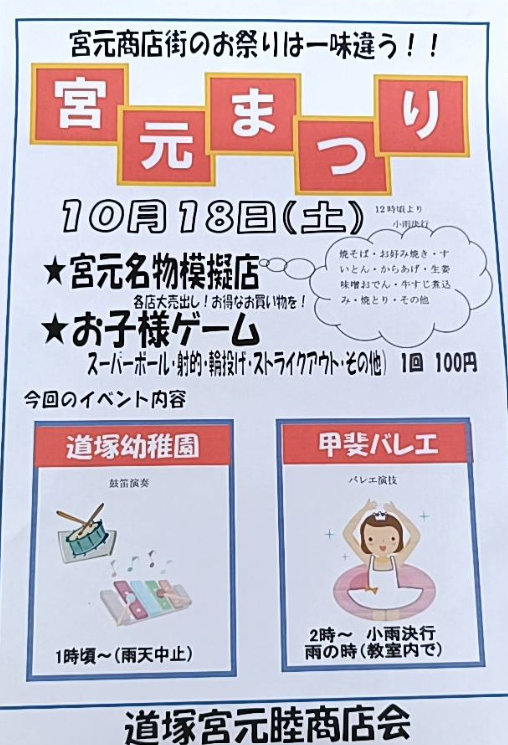 2025年10月18日(土)道塚宮元睦商店会が「宮元まつり」を開催します。