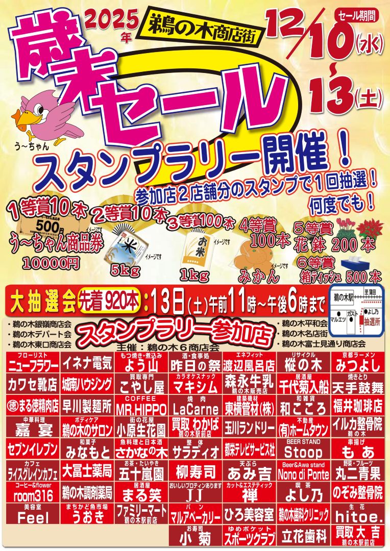東京都大田区にある鵜の木商店街で、2025年12月10日(水)~13日(土)まで「歳末セール」スタンプラリーが開催されます!