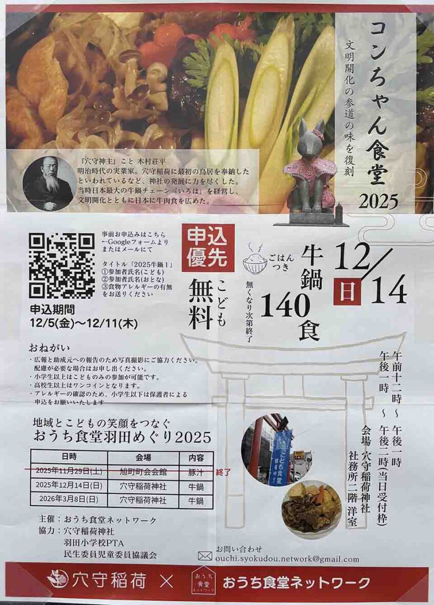 羽田で誕生し、自宅で行う子ども食堂の普及活動を続けている「おうち食堂ネットワーク」が、穴守稲荷神社などの協力を得て、「コンちゃん食堂」を開催します。