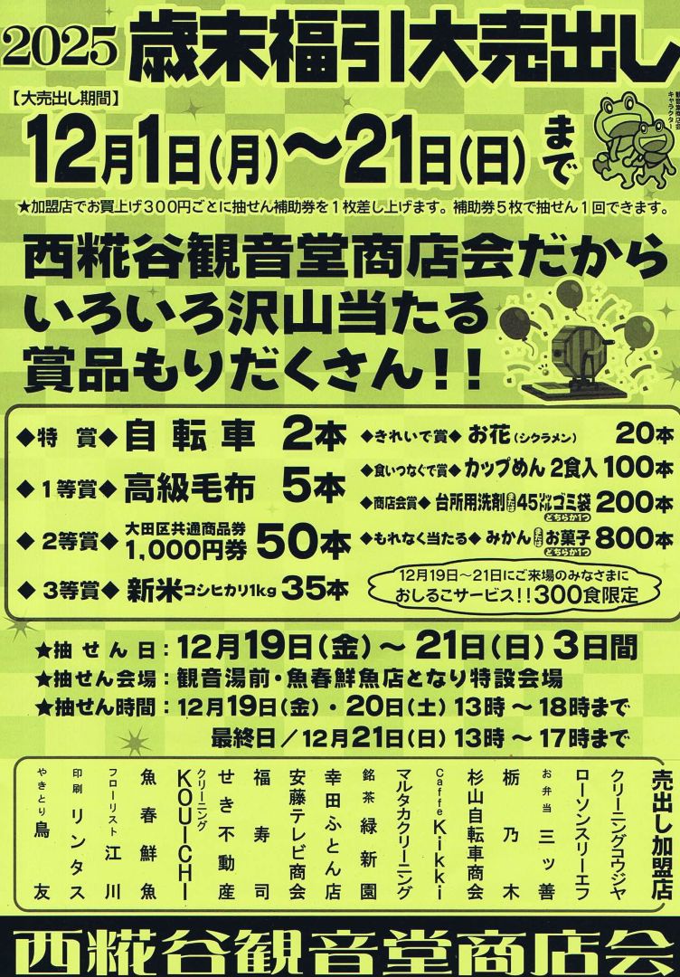 東京都大田区西糀谷にある西糀谷観音堂商店会にて「歳末福引大売出し」が開催中。特賞はなんと自転車!色々盛りだくさんの楽しい抽選セールです。