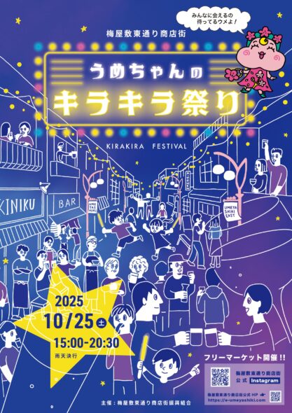 梅屋敷東通り商店街で「うめちゃんのキラキラ祭り」を10月25日(土)に開催します。当日はフリーマーケットも同時開催予定!