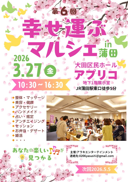 2026年3月27日(金)10:30~16:30、東京都大田区蒲田にある大田区民ホールアプリコにて「幸せ運ぶマルシェ」が開催されます。