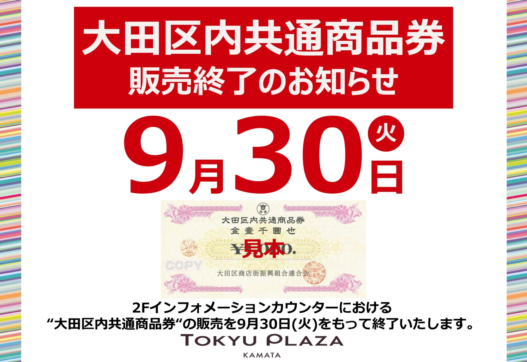 東急プラザ蒲田店2Fインフォメーションにおける 「大田区内共通商品券」の販売は9月30日をもって販売を終了します。
