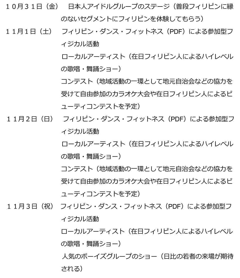 「日比友好 歌と踊りの祭典 in 蒲田」は、日本とフィリピンの文化交流をテーマに、歌と踊りで地域をつなぐ国際親善イベントです。大田区の支援を受けて開催され、4日間で約2万人の来場を見込んでいます。飲食の露店も多数出店します。