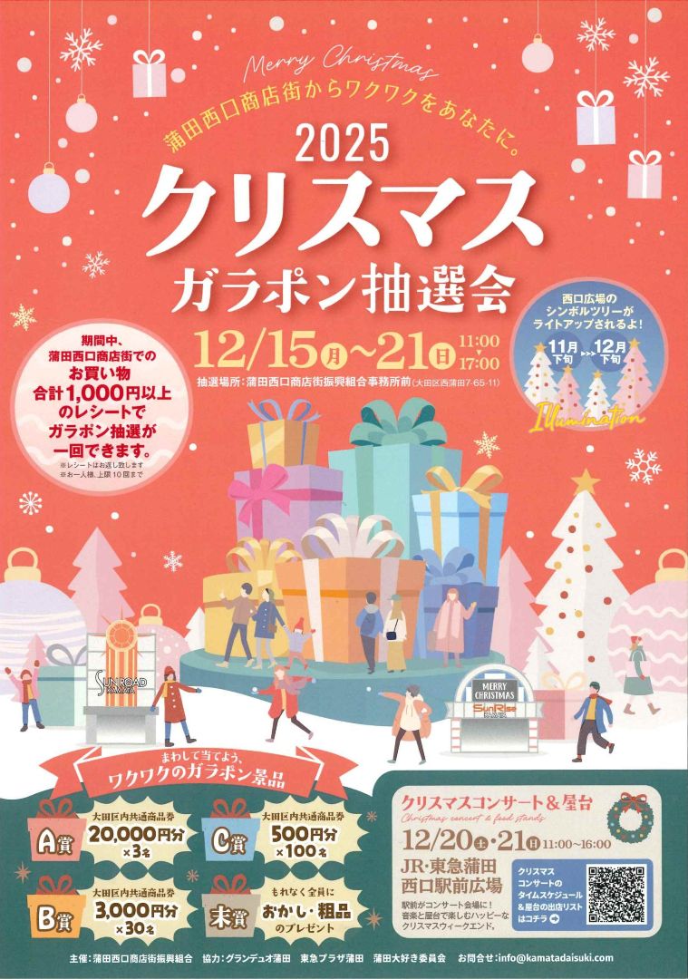 蒲田西口商店街振興組合では、2025年12月15日(月)~21日(日)「クリスマスガラポン抽選会」を開催します。