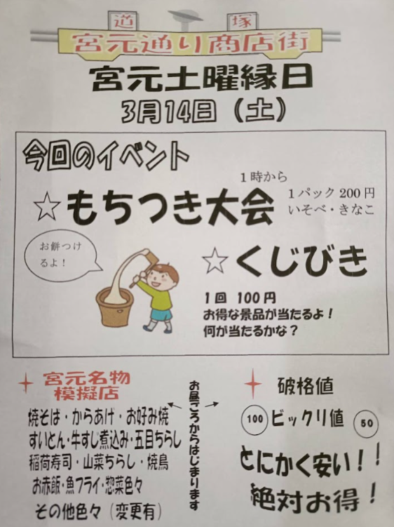 道塚宮元睦商店会が「土曜縁日」を開催します。今回のイベントはもちつき大会とくじびきです。