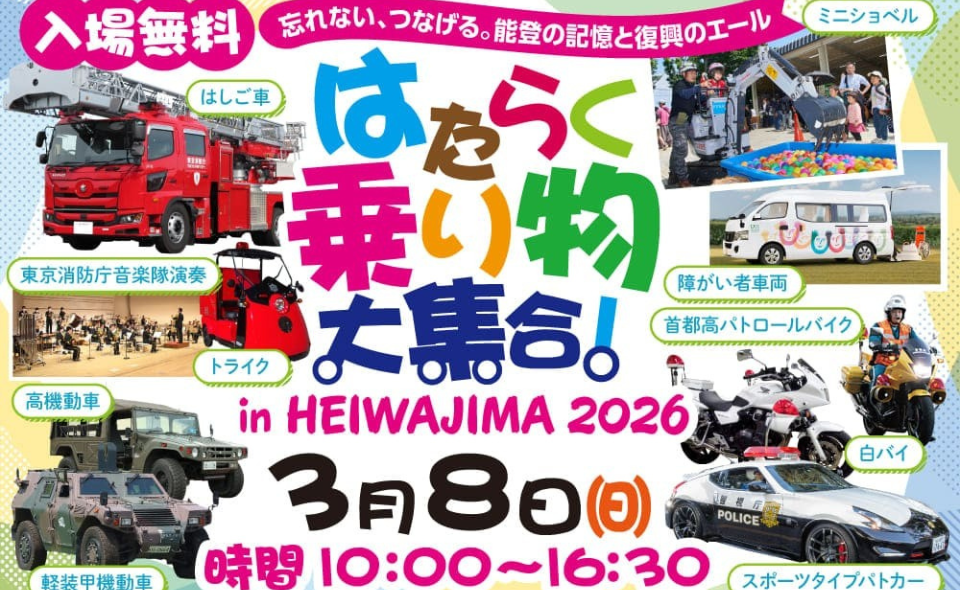 2026年3月8日(日)、BIGFUN平和島・ボートレース平和島で「はたらく乗り物大集合! in HEIWAJIMA2026」が開催されます。