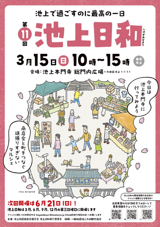 「池上で過ごすのに最高の一日」をコンセプトにした、池上地区商店会連合会 池上日和実行委員会主催の新しい定期市「池上日和」は3か月に1度、池上本門寺の総門前を中心に開催します。