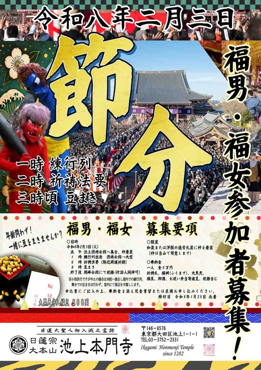 令和8年は池上本門寺が練行列や境内大舞台からの豆まきを予定しています。