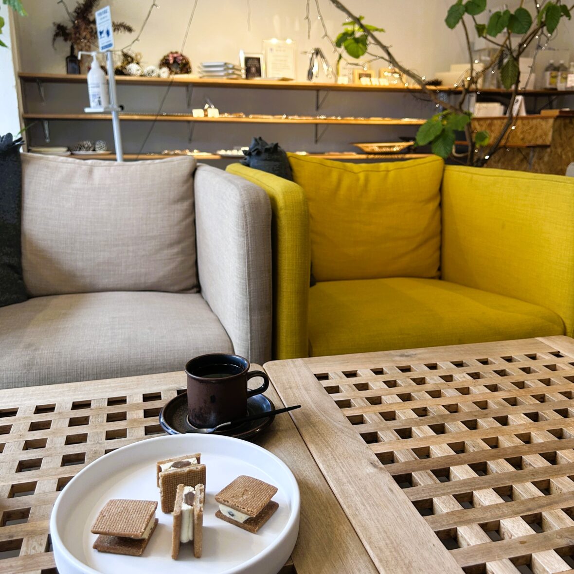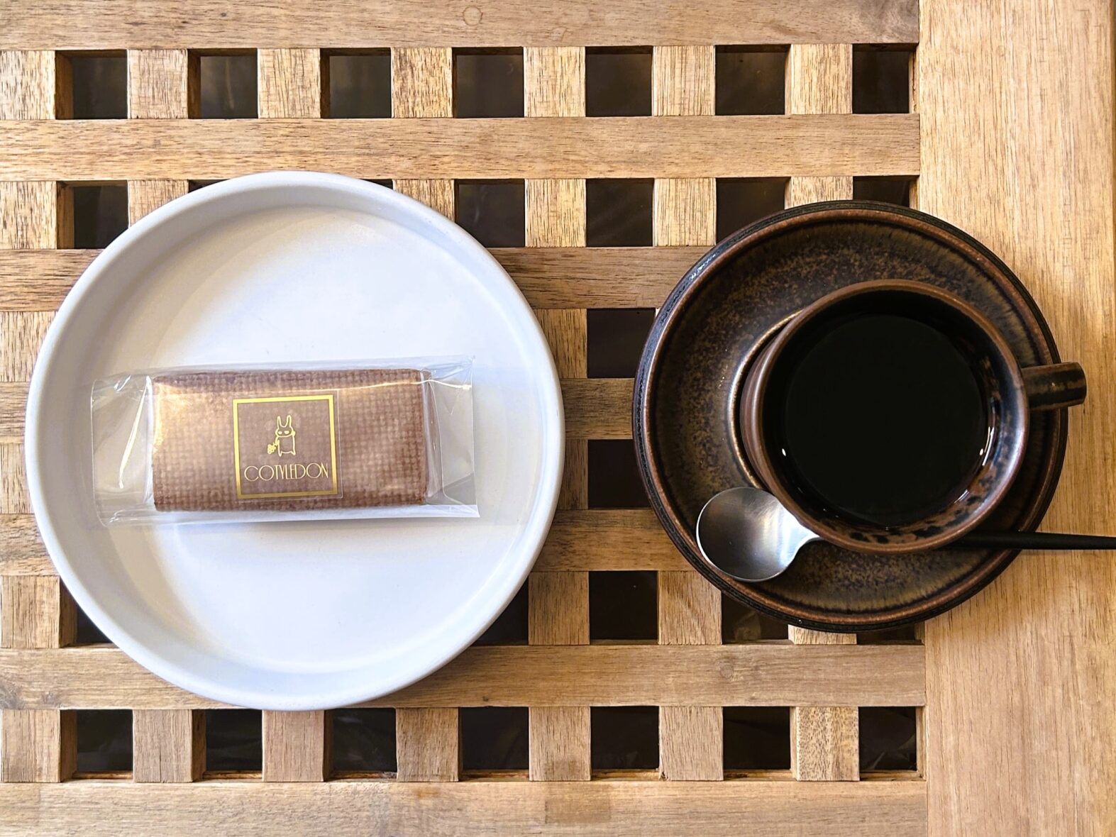 一つずつ異なる手描きパッケージは、贈り物としても好評です。イートインも可能で、カフェスペースでゆったりと楽しめます。