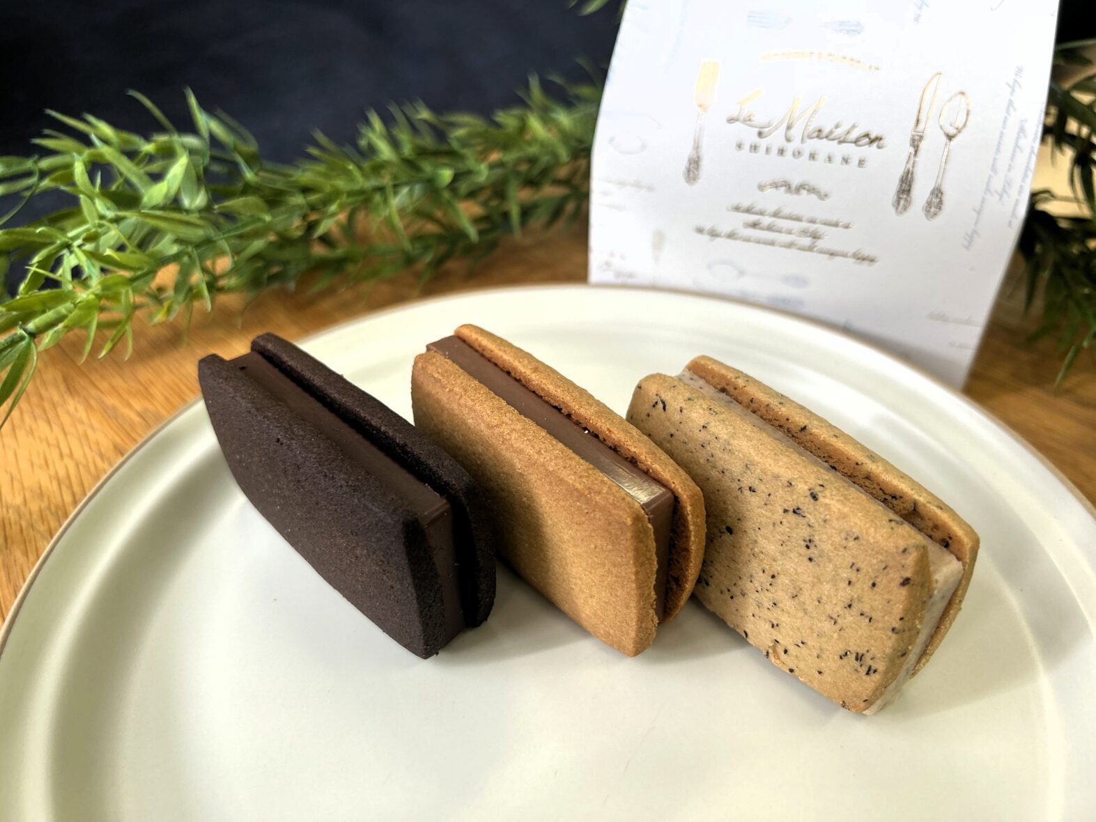 分厚いチョコレートはくちどけが良く、サクサク食感のクッキーが絶妙に重なり合う「ショコラサンド」。ビターは定番商品で人気。キャラメルは濃厚ながらも甘さ控えめ、香ばしいクッキーとのバランスが抜群。アールグレイは紅茶の香りが広がり、軽やかな口当たりで大人の味わい。