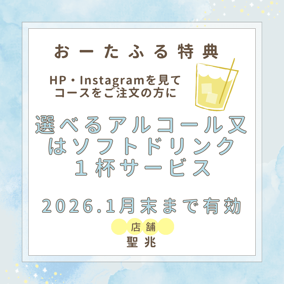おーたふるHP・Instagramをみて、コースをご利用のお客様に、選べるアルコール又はソフトドリンクを1杯サービス!