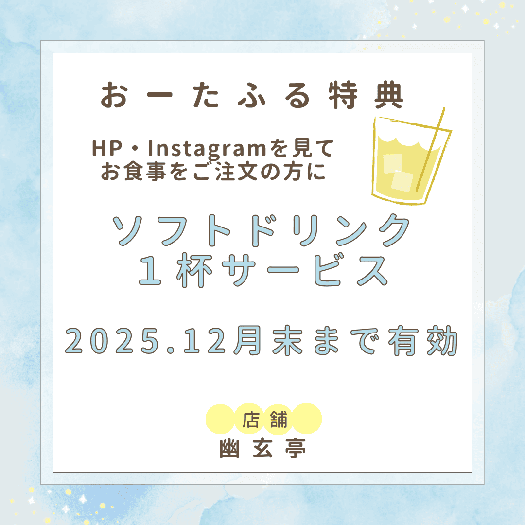 おーたふるHP・Instagramをみて、お料理メニューご注文の方にソフトドリンク1杯サービス!
