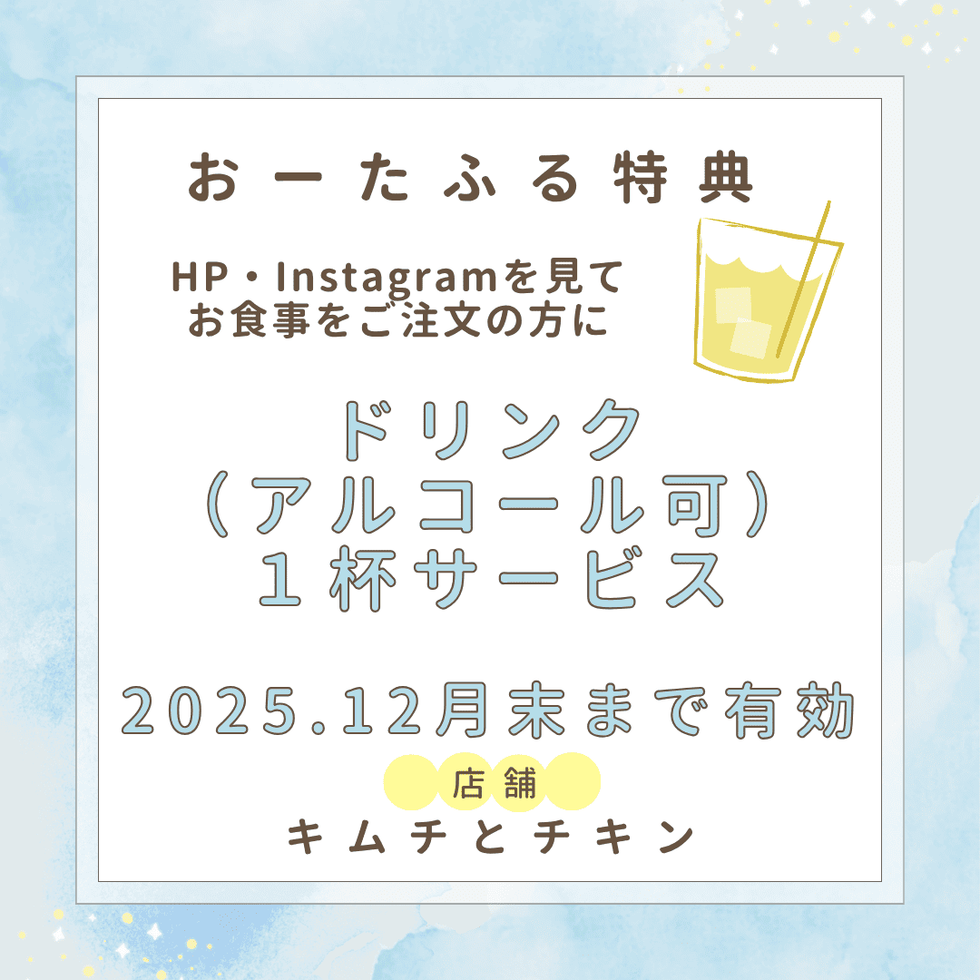 おーたふるHP・Instagramをみて、お料理メニューご注文の方にドリンク(アルコール可)1杯サービス!