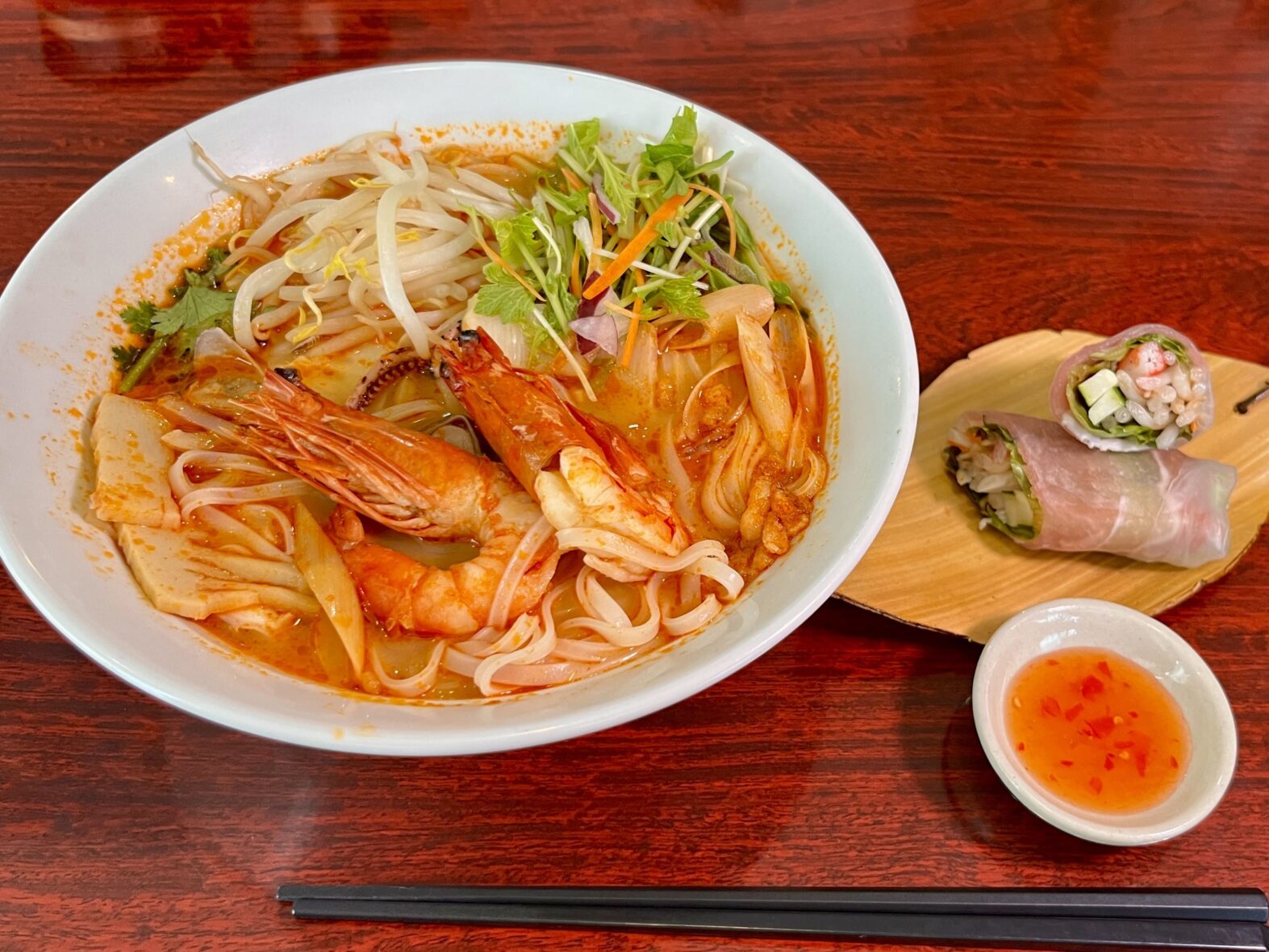 おすすめは、存在感のある大きな海老とハーブスパイスの香りが食欲をそそる「トムヤムヌードル」。ベースは日本人の舌に合うよう辛さ控えめに仕上げてありますが、卓上の唐辛子、砂糖、お酢、ナンプラーといった調味料で、タイ料理式にお好みの辛さや味に調整できるのが楽しいですよ。