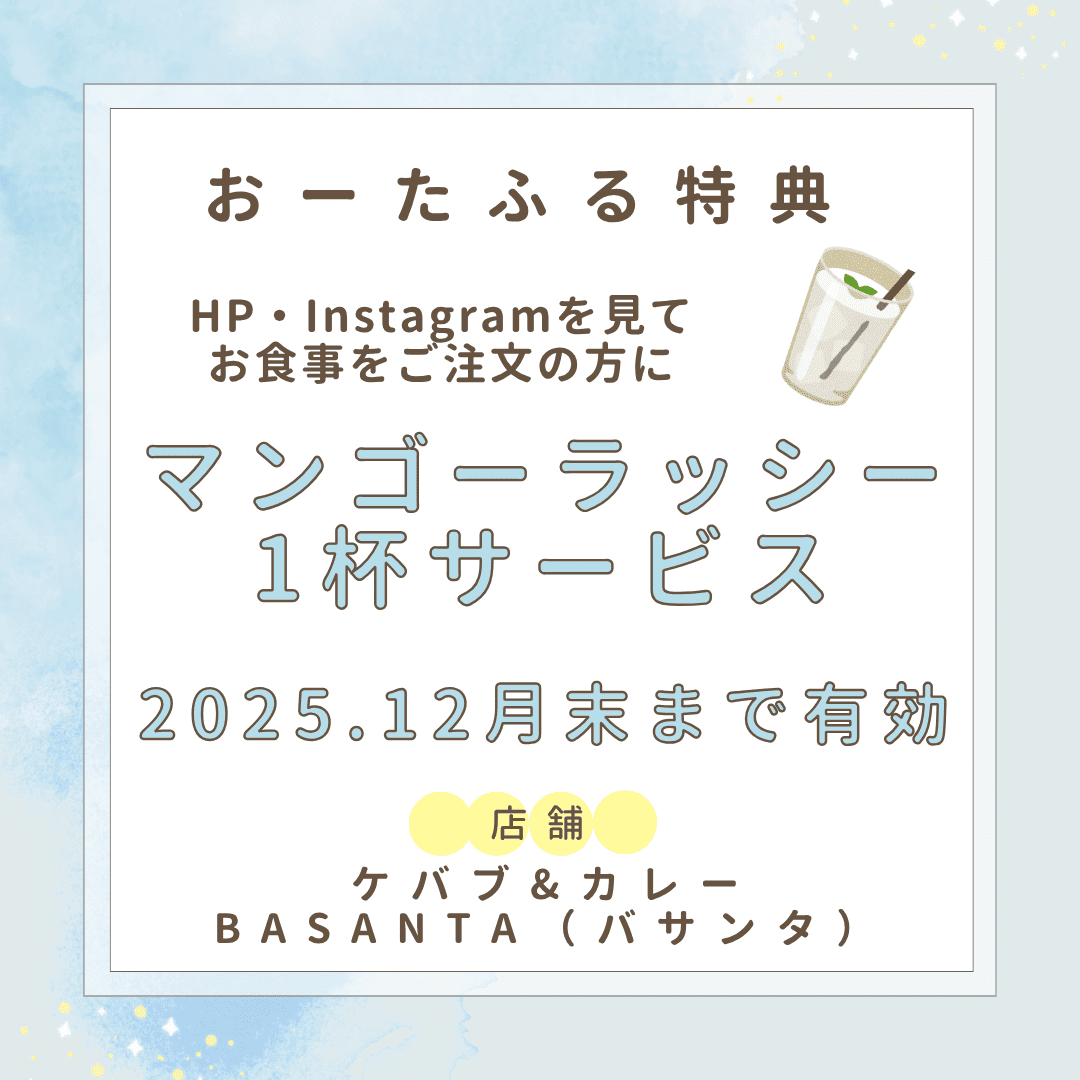 おーたふるHP・Instagramをみて、店内でお食事ご注文の方にマンゴーラッシー1杯をサービス!