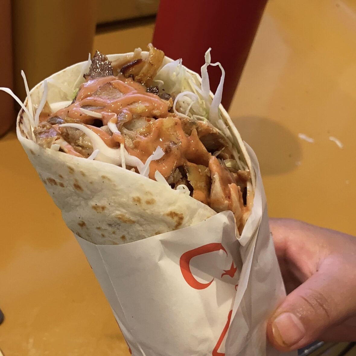 店先から見えるドネルケバブの縦型グリルは、通りを歩く人の食欲をそそる名物!一番人気の「ケバブラップ」は、お肉の焼き加減とケバブ独特の味付けが絶妙。何より”手に持つとずっしり重い”と評判の、大満足間違いなしのボリューム満点の一品です。
