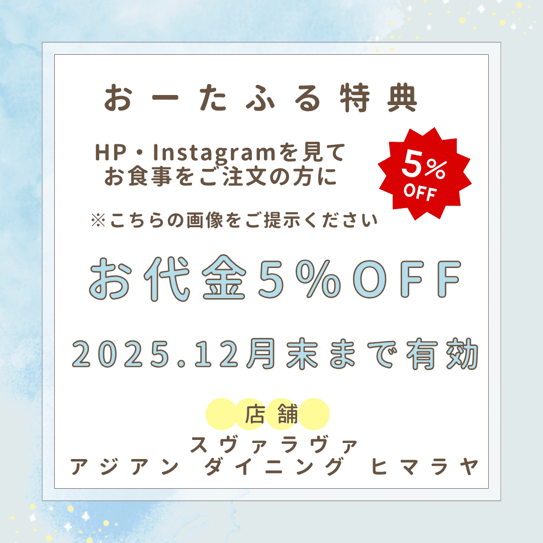 おーたふるHP・Instagramをみて、お食事をご注文の方にお代金の5%割引!