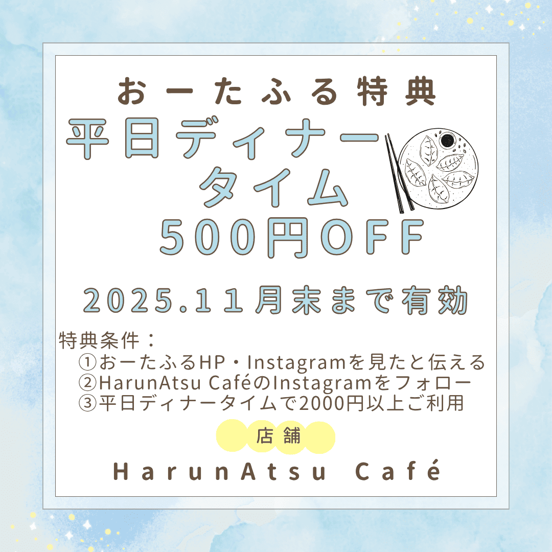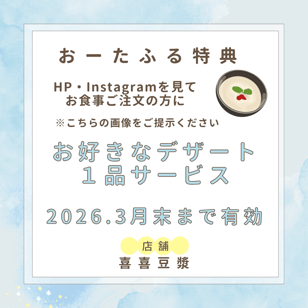 特典条件:①おーたふるHP・Instagramを見たと伝える ※下記画像をご提示ください。