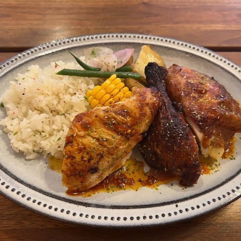 看板メニューは、こだわりの国産若鶏を使用したロティサリーチキン!じっくりと焼き上げられたチキンは、ジューシーで柔らかく、店主オリジナルのスパイスの味付けがやみつきになります。大人からお子様まで幅広く支持される自信作です。