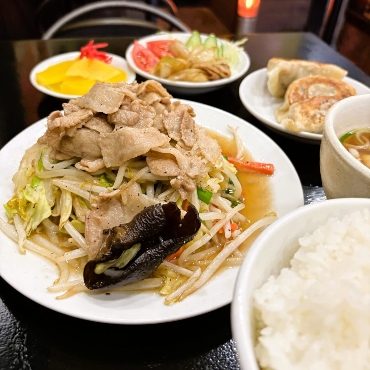 今回はファンの多い「肉野菜炒め+餃子定食」を注文。山のように盛られた野菜はシャキシャキで、豚肉の旨みがしっかり絡みます。大ぶりで餡ぎっしりの餃子と、日替わりの小鉢も嬉しいポイント。