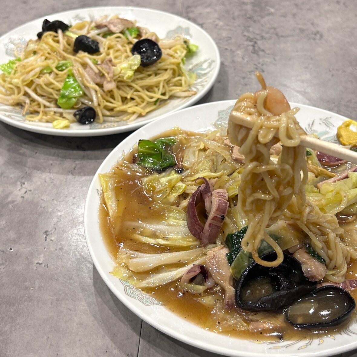 今回のおすすめは「上海やきそば」と「やきそば(あんかけ)」。上海やきそばは醤油味で、きくらげや豚肉、野菜がたっぷり入った食べごたえのある一皿。あんかけ焼きそばは、珍しい両面焼きの麺に、イカやエビが入った五目あんが絡みます。