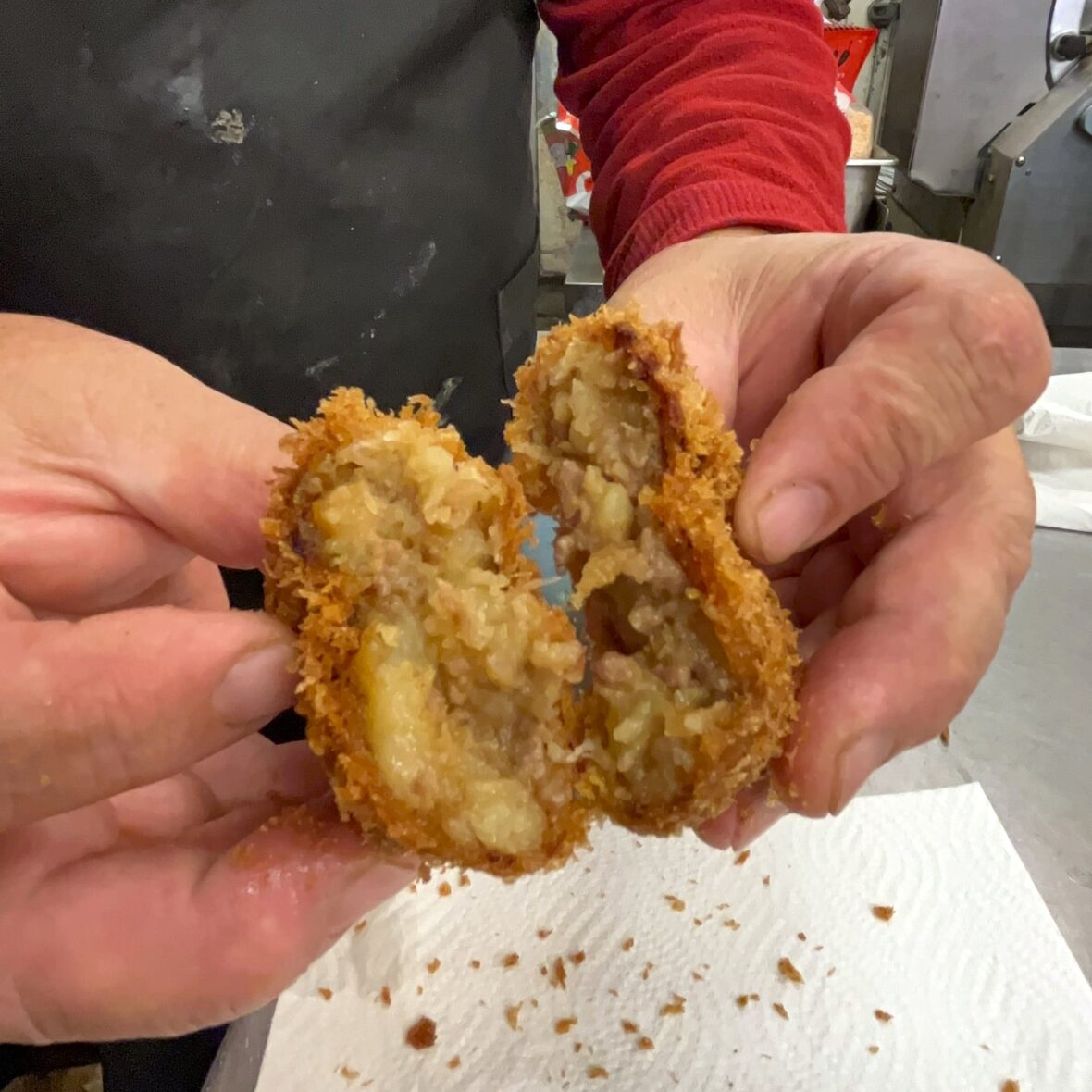 多い日には300個も売れるという牛肉コロッケは、5分ほどかけてじっくりと揚げるため、衣は驚くほどサクサク!ホクホクのじゃがいもと、牛肉・玉ねぎの甘味が口いっぱいに広がります。揚げたての熱々を頬張れば、誰もが笑顔になること間違いなし!