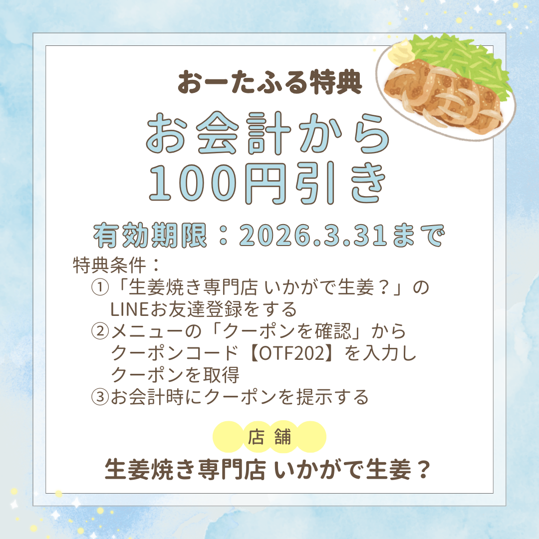 「生姜焼き専門店 いかがで生姜?」のLINEお友達登録をし、クーポンコード【OTF202】と入力。取得したクーポンをお会計時に提示すると、お会計が100円引きに!