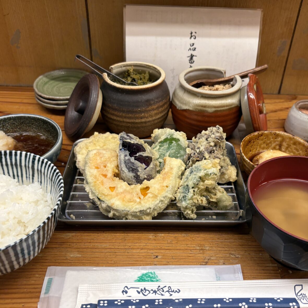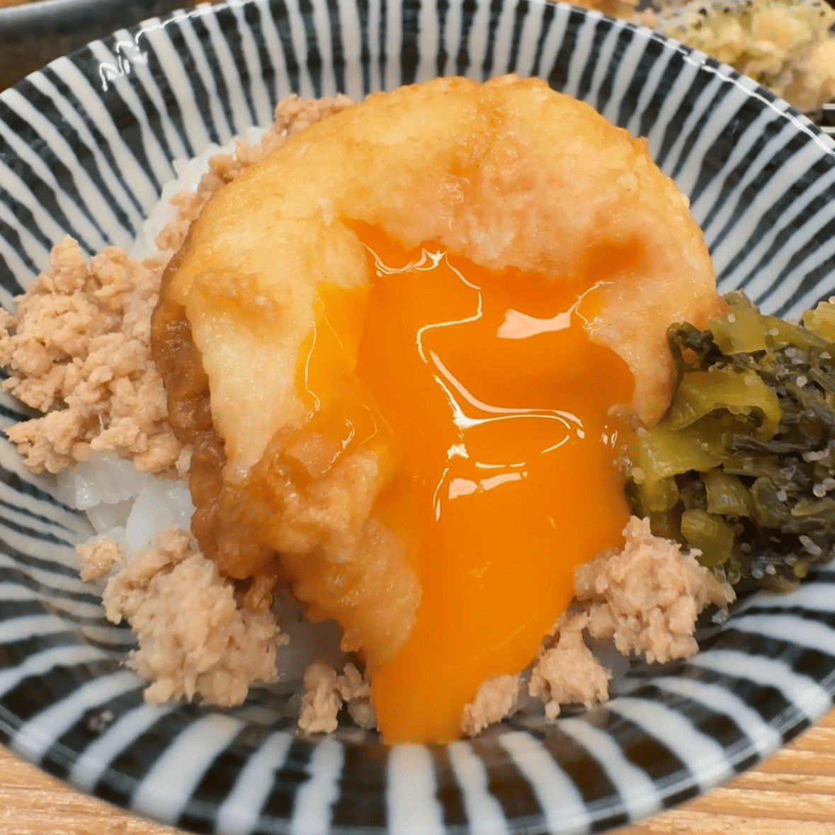 中でも女性客に人気の「野菜天ぷら定食」は、野菜6種に半熟卵を加えた計7品の天ぷらが、なんと1,100円で楽しめるメニュー。揚げたてはもちろん、野菜本来の甘みや食感がしっかり感じられ、最後まで飽きずにいただける満足度の高い定食です。さらに嬉しいのは、食べ放題の鶏そぼろと高菜明太をご飯に好きなだけのせられること。そこへ半熟卵の天ぷらをひとつ落とせば、思わず笑顔になる“贅沢ごはん”の完成です。