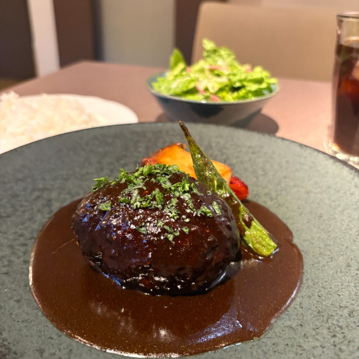 ランチで大人気の数量限定メニュー「宮崎牛ハンバーグ 温野菜添え—特製デミグラスソース—」。上質な宮崎牛を使用した肉肉しさあふれるハンバーグに、自慢の14日間煮込んだ濃厚デミグラスソースをたっぷりとかけました。あふれ出る肉汁とコク深いソースが絡み合い、一口ごとに後を引く美味しさです。ご飯は「筑波山麓厳選ふくまる」を使用し、サラダとドリンクもセット。1,680円という破格で、本格洋食ランチを存分に味わえます。