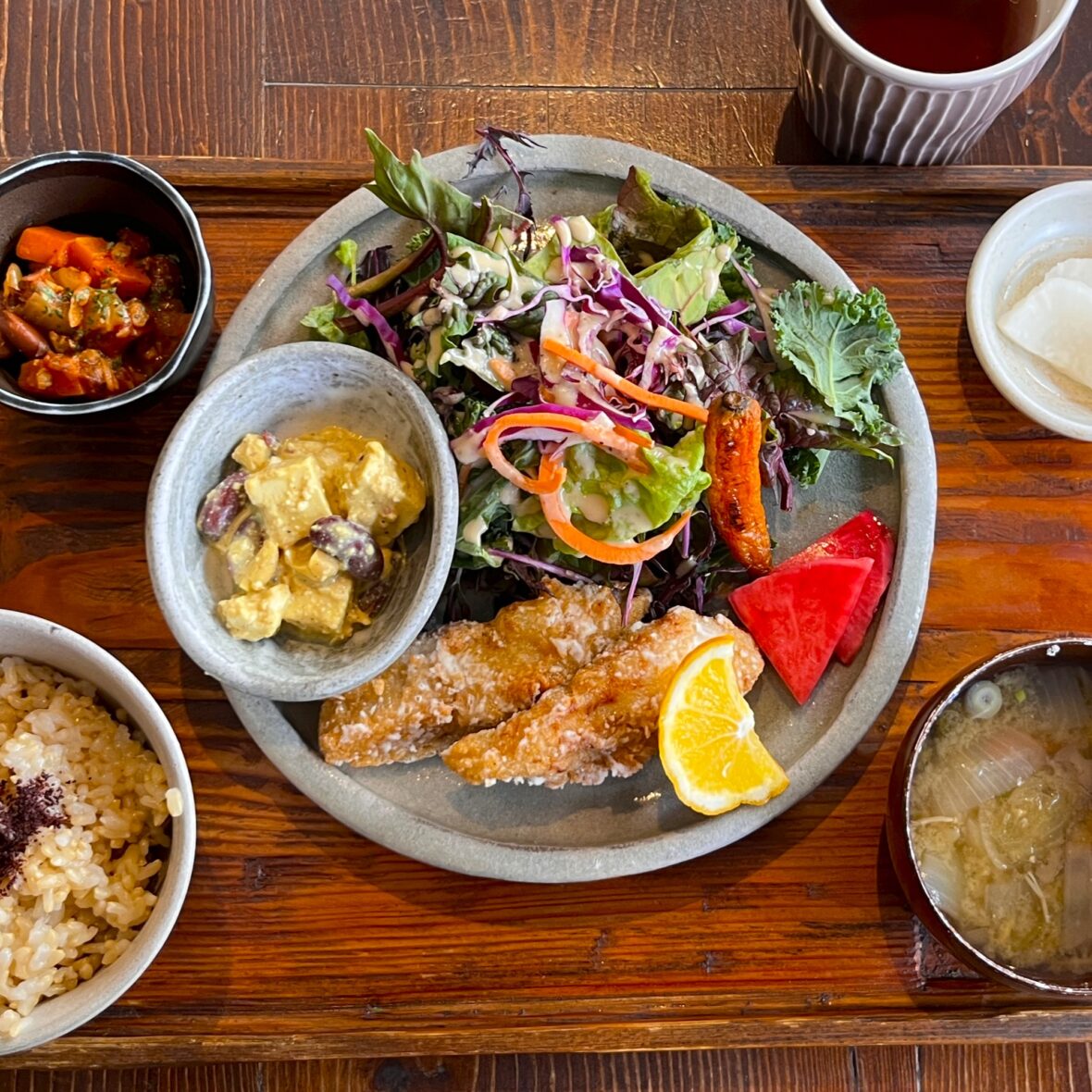 ランチは、こだわりの有機食材をふんだんに使った、身体にやさしい料理を自分好みに選べる定食スタイル。メインのおかずを一品選び、さらに“本日のお惣菜”を2品(1,430円)または3品(1,650円)から組み合わせられます。もちもちの玄米ごはん、具沢山のお味噌汁、自家製おしんこ、そして健康茶までセットになった、内容もバランスも大満足のランチです。