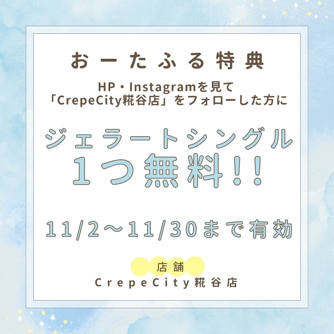 特典:おーたふるHP・Instagramを見て「CrepeCity 糀谷店」をフォローしていただいた方、