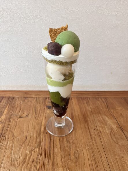 抹茶のジェラートときな粉餅のジェラートや、胡麻のお菓子、黒糖のゼリーなど、使用されている素材のマリアージュが素敵。満足度の高いパフェです。