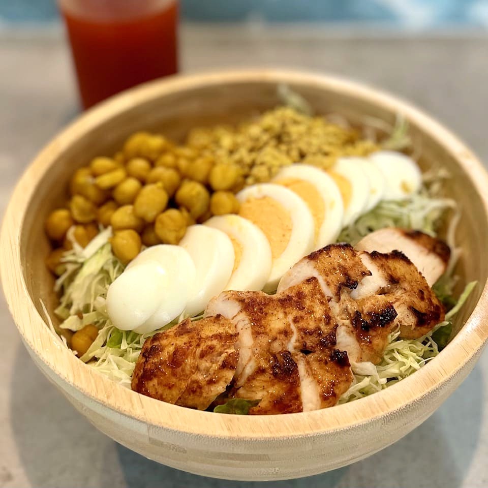 ライスなしでヘルシーに楽しめる「バモベジ」は、生野菜やキーマ、名物の「チキンの香辛料焼き」が盛られた、体作りを意識する方にも嬉しい一皿。